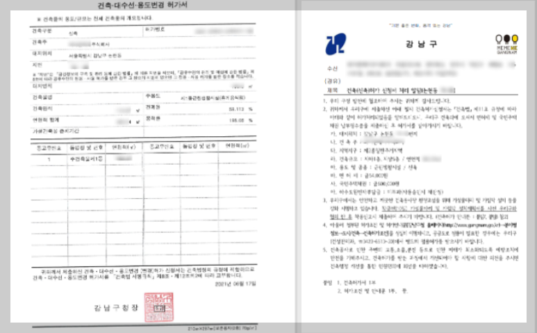 건축 허가 접수 후에 강남구청에서 보완 사항이 나와서 몇 차례의 서류 작업을 반복하였고, 거의 한 달만인 6월 18일 드디어 건축 허가를 받을 수 있었습니다. 생각보다 건축 허가를 받는데 오랜시간이 걸렸습니다.